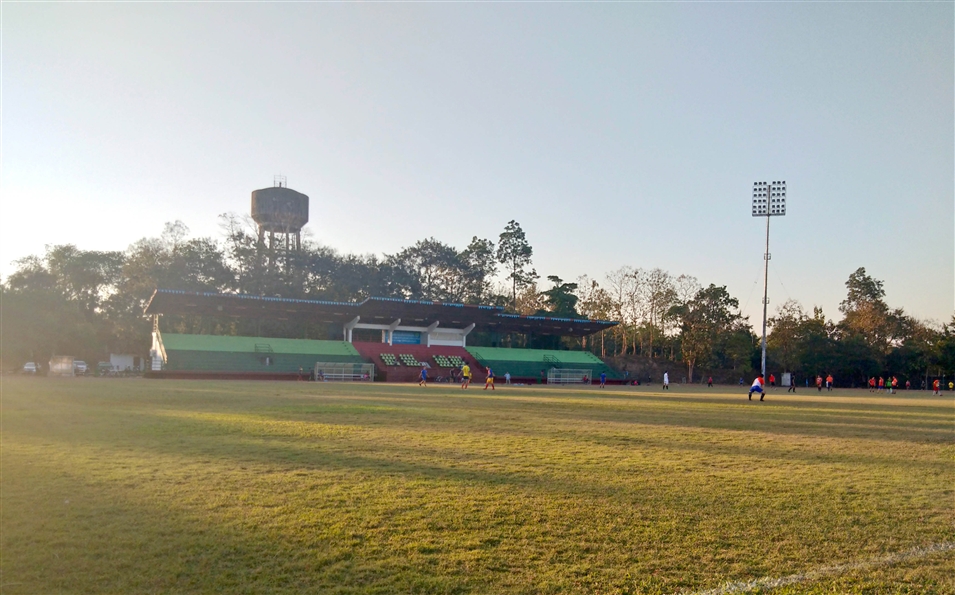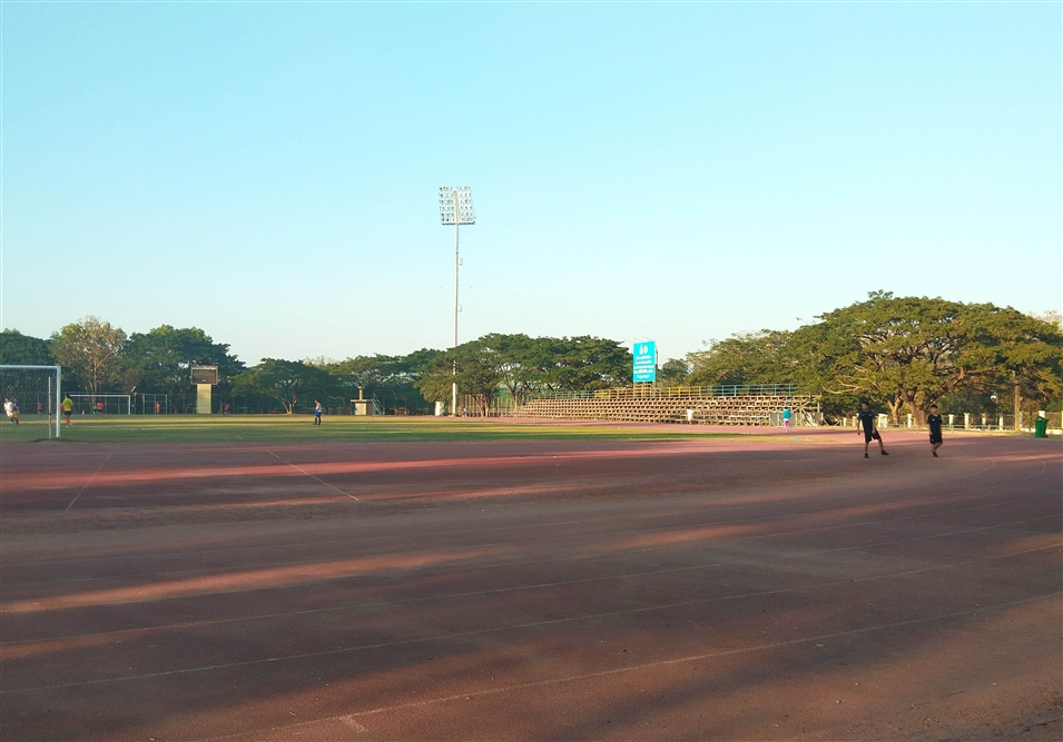 老撾國(guó)立大學(xué)的同學(xué)就很喜歡踢足球,足球場(chǎng)在學(xué)校的東面,球場(chǎng)正面是主席臺(tái),側(cè)面還設(shè)有一處看臺(tái),大約可以容納270名觀眾。跑道一圈也是400米,占地面積很大。球場(chǎng)中間的草是真草,有專門的人員養(yǎng)護(hù)。