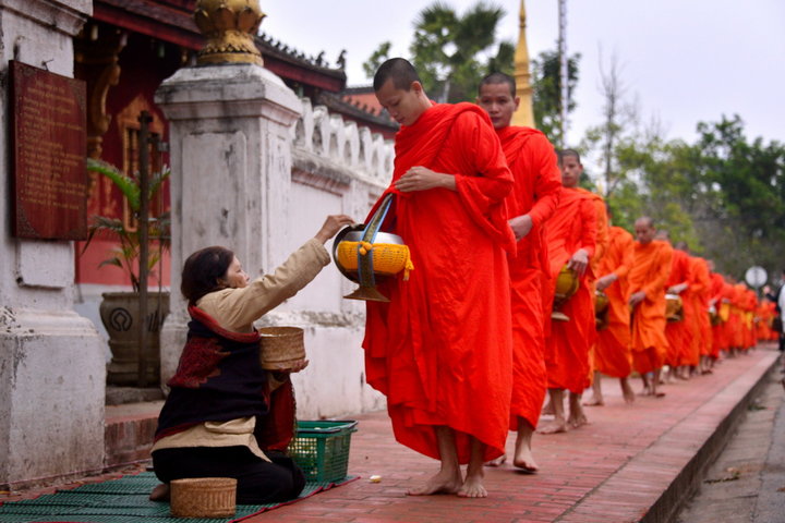 瑯勃拉邦的寺院是不開伙的,僧人每天清晨赤腳走向大街小巷尋求布施,信徒們鋪張席子,跪在路旁,每天將清晨親手做的第一鍋米飯贈與僧侶,成為瑯勃拉邦一道獨特的風(fēng)景線。
